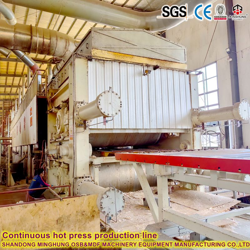 Длинной платеной: OSB использует клей (обычно фенолформальдегидную смолу - PF), которые лечат при более высоких температурах, что требует более длительного времени пресса. Длина непрерывного пресса (обычно от 30 до 50 метров) обеспечивает достаточное время для пресса для обеспечения полноценного отверждения смолы. Более длинное нажатие также позволяет лучше управлять параметрами процесса в различных зонах прессы.